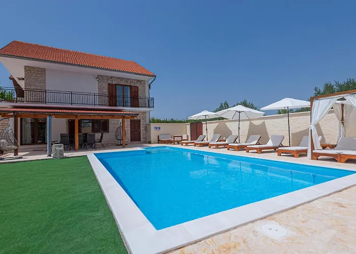 Az Awesome Home In Sibenik With Outdoor Swimming Pool And 4 Bedrooms szálláshelyet kínál, és kocsival 46 percre van a Zadar repülőtértől. A szobákban műholdas TV-t, klímaberendezést és vezeték nélküli internetet biztosító villa teljesen felszerelt konyhát is nyújt mikrohullámú sütővel, mosogatógéppel és hűtővel.